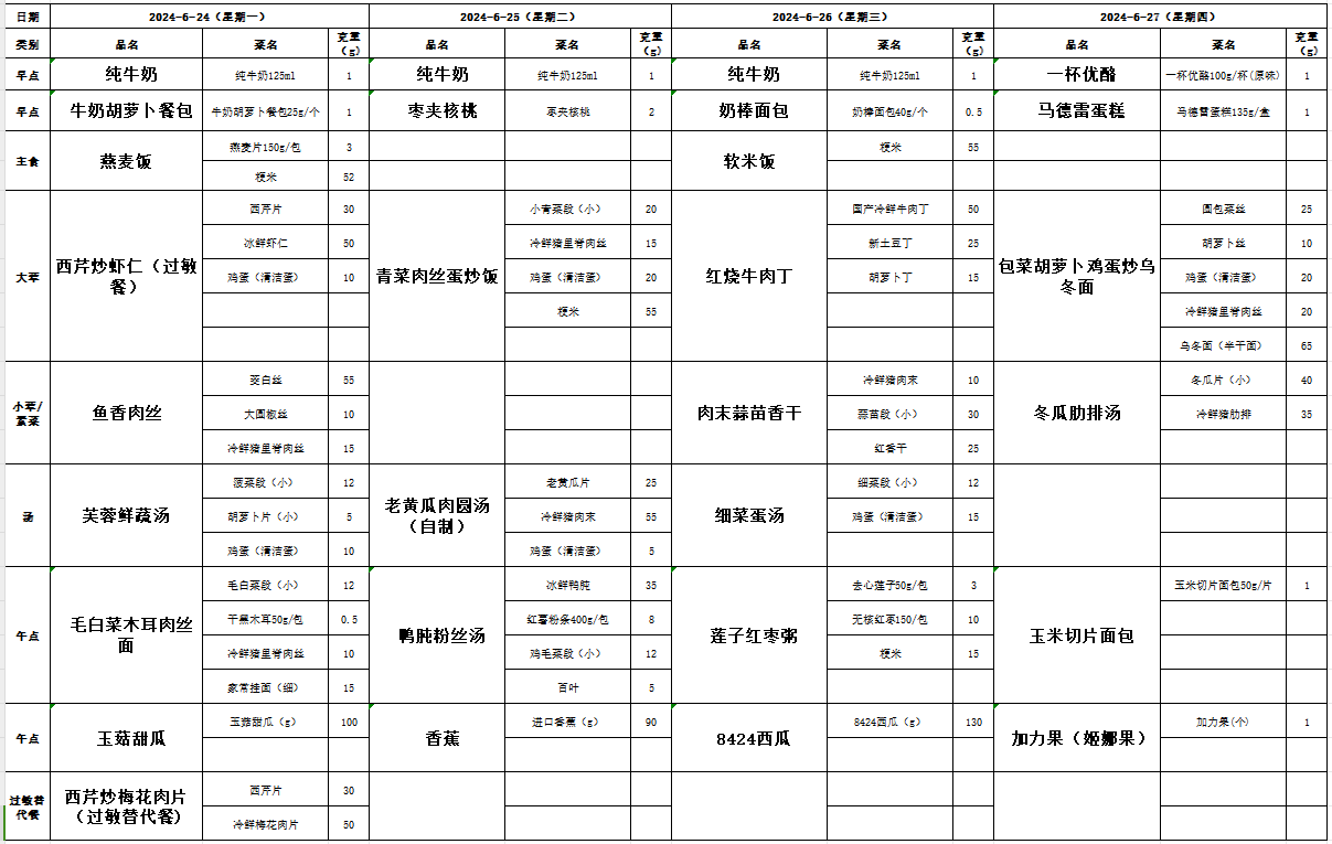24.6.24-6.27幼儿园食谱克重表